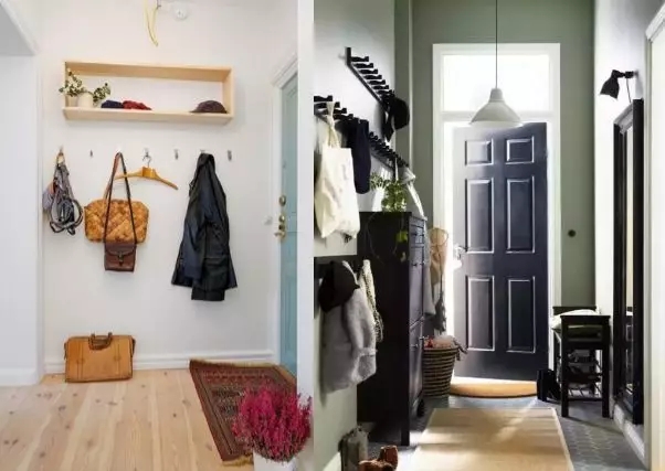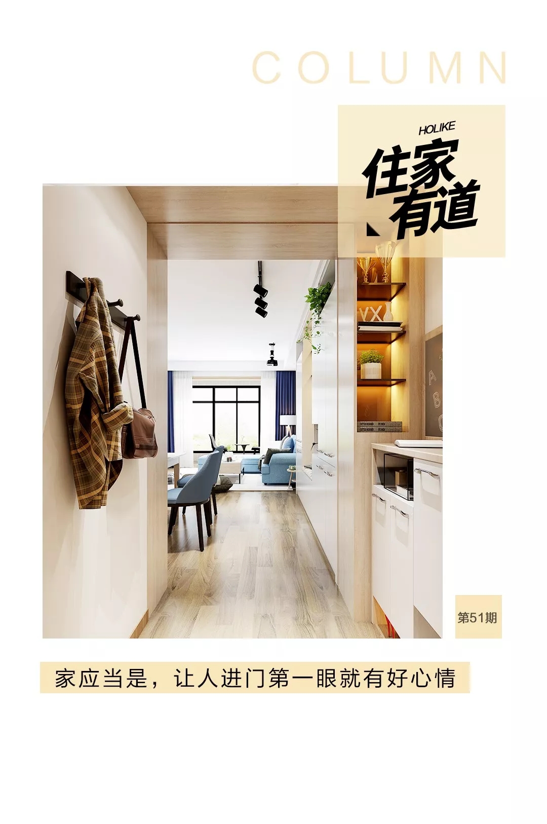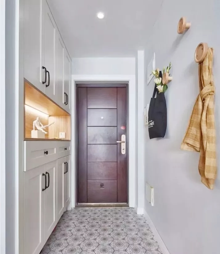 如果玄关两旁的墙体不是承重墙,不妨改造一下,做成嵌入式,两边空间都能合理利用。