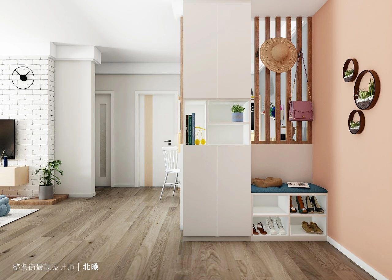 玄关左侧打造到顶柜子,顶部可放不常用物品,中间的开放格放手机、钥匙等小物件正合适,底部可同时收纳20双鞋,满足女主人买买买的欲望;右侧是较矮的开放格,方便摆放常用的鞋子,上方铺个软垫,坐着换鞋更舒适。