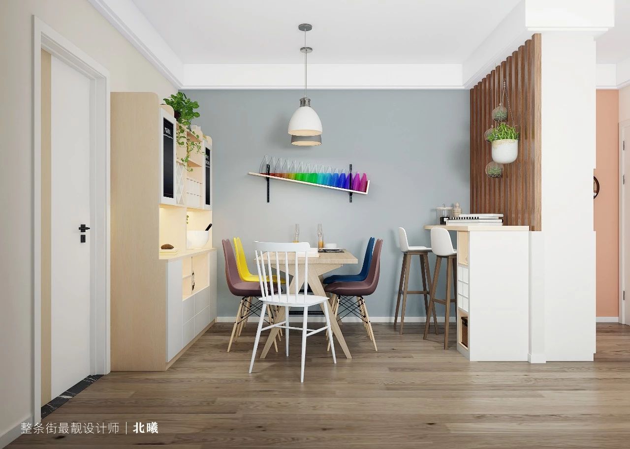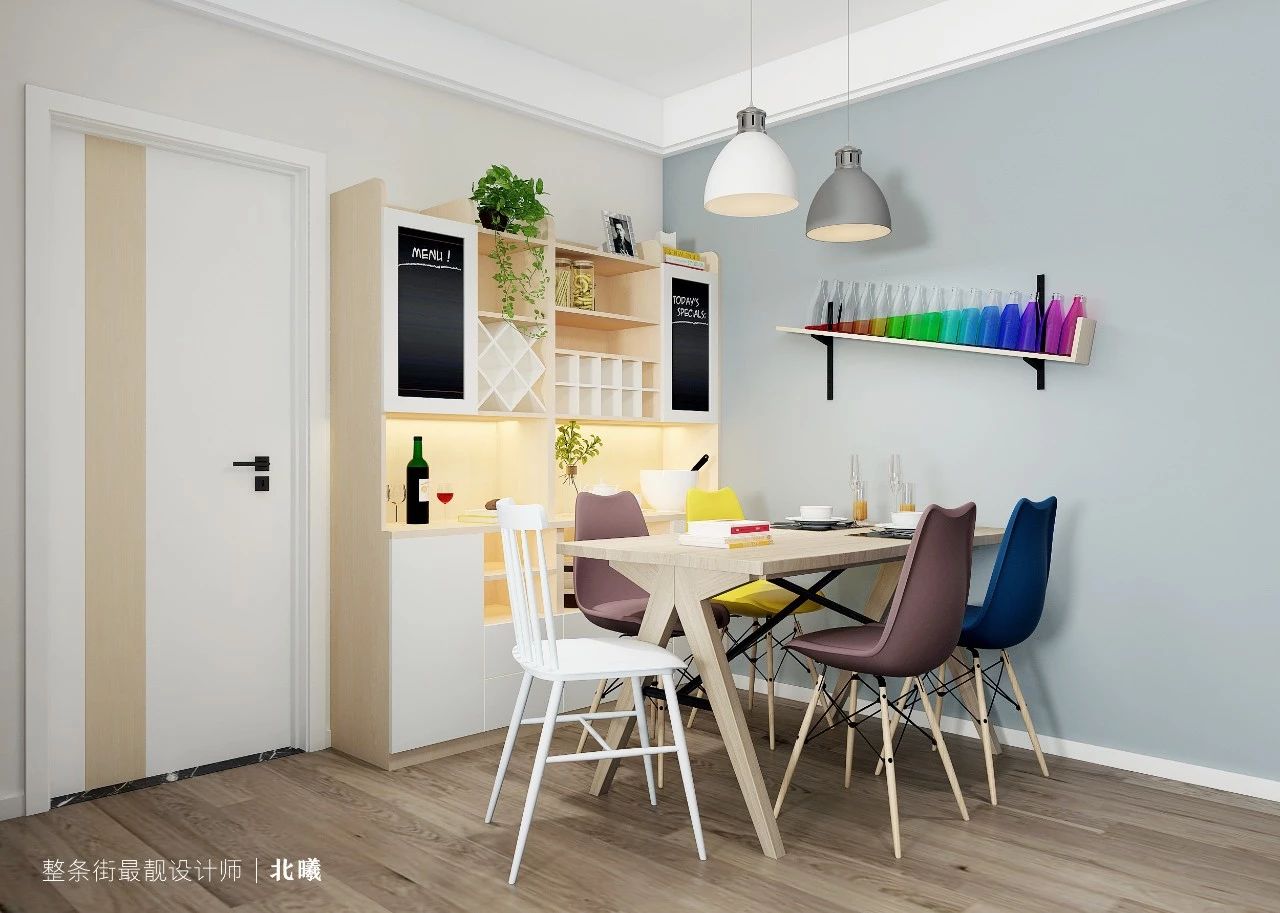 为了满足夫妻二人的收纳需求,靠墙一侧做了一个不到顶的餐边柜,虽然容易积灰,但给空间留白,视觉感极好,就连有洁癖的女主人也说为了颜值,不介意经常打扫。
