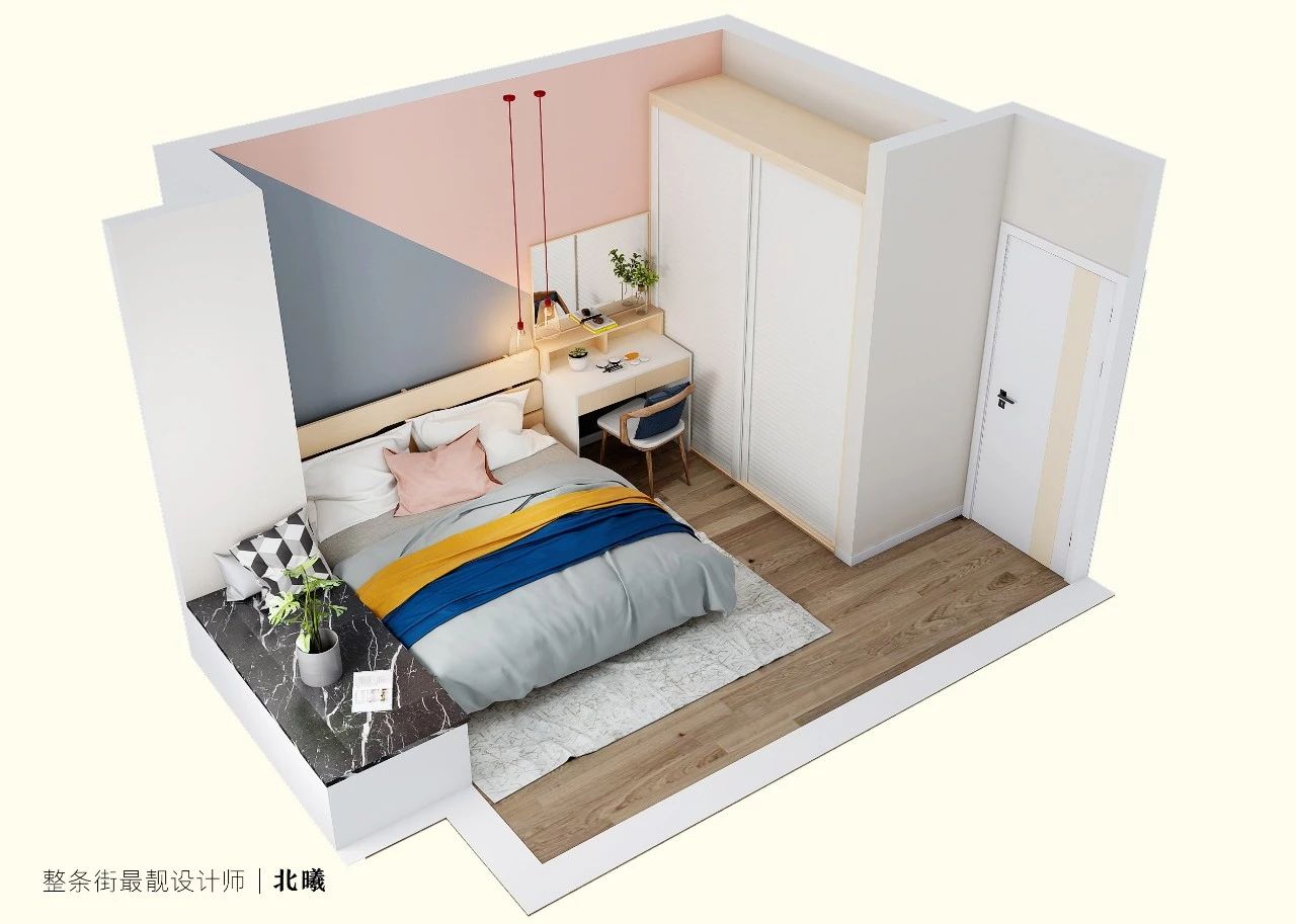 卧室作为日常休息空间,业主希望简简单单就好,所以主卧还是延续了全屋的现代简约风格,浅粉+浅灰的墙面使这个空间不大的卧室,显得舒适而温馨,浅原木色系家具能让人安心入眠。