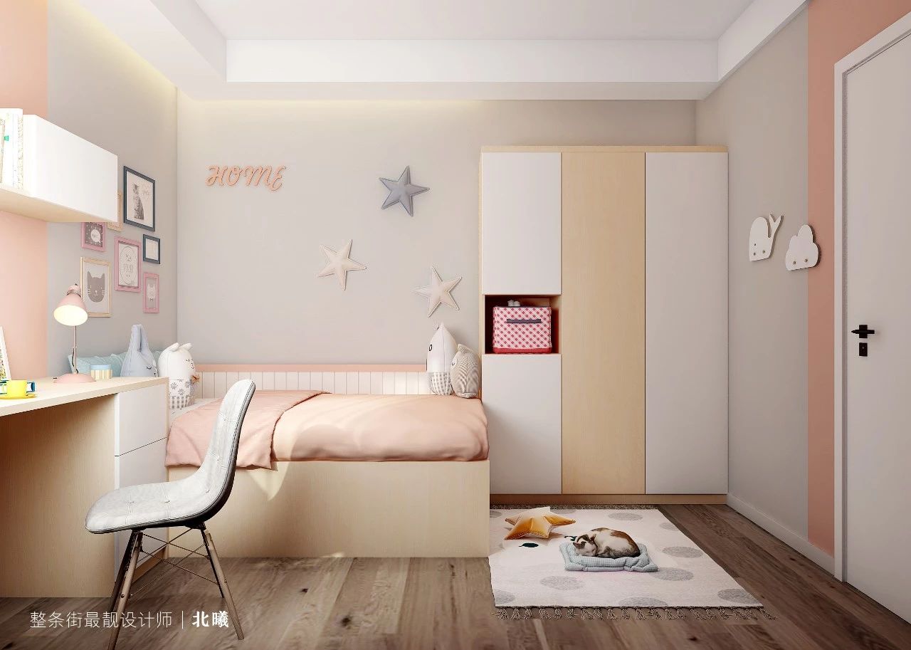 因为还没有小孩,加上儿童房空间并不大,所以业主并没有把房间填得满满的,而是做了留白,留给孩子更多发挥的空间,让孩子根据自己的喜好进行布置。