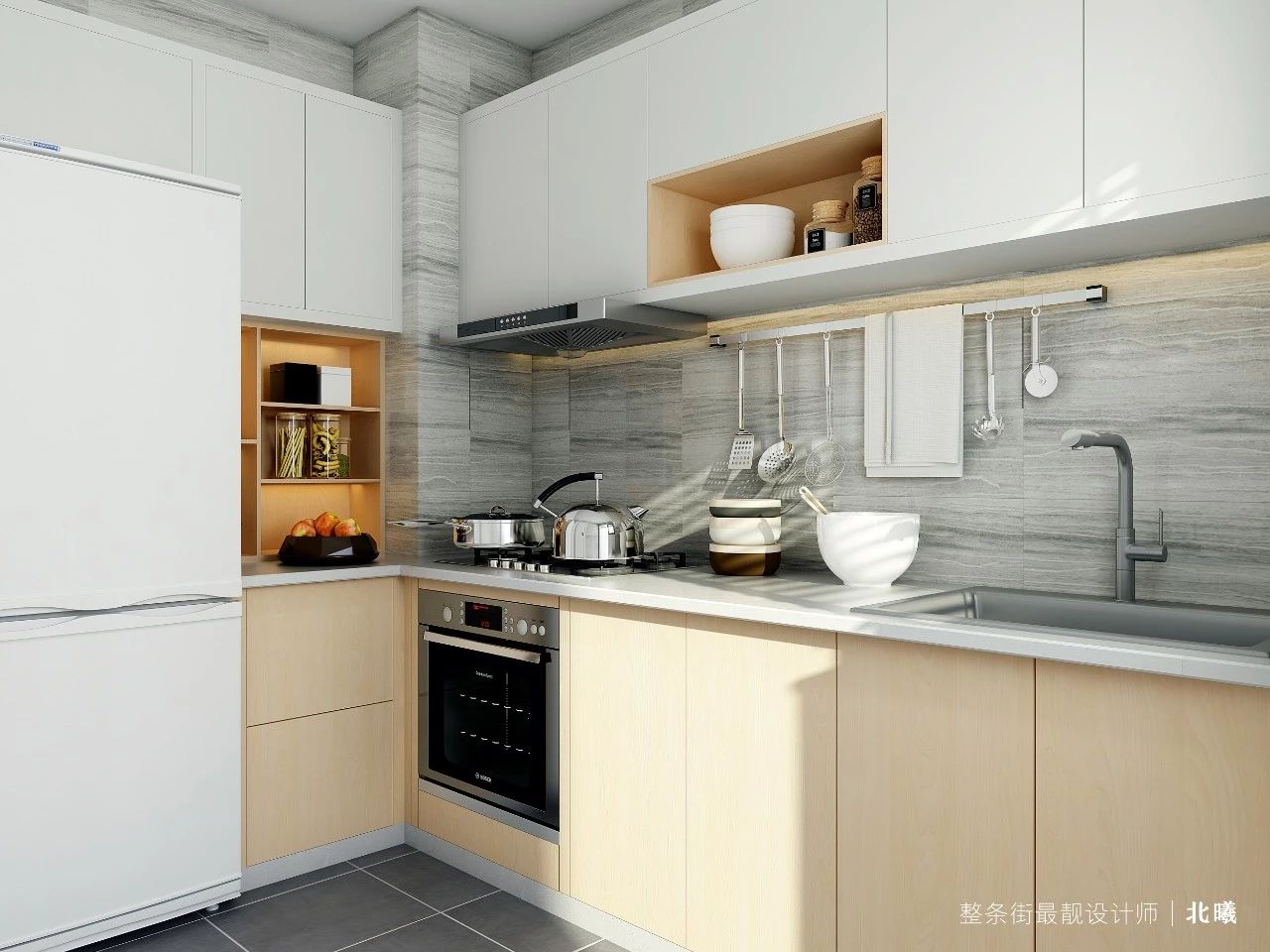 业主喜欢浅色系又有洁癖,那厨房该用什么颜色?幸亏业主平时不怎么在家里开火,所以这个被大家公认最难打理的空间就大胆用了白色吊柜门,浅灰色瓷砖、白色台面和浅原木色橱柜门,这样的色彩搭配,与全屋风格统一,还透出温馨的气息。