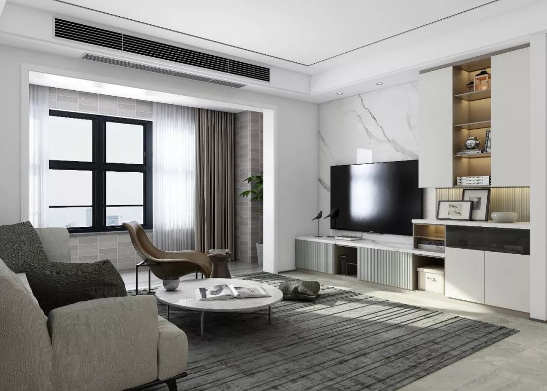 ▲L字型布局的电视柜确保客厅强大的收纳功能,大理石的点缀则增加了几分轻奢气息